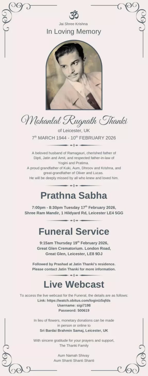 Prathna Sabha and funeral arrangement details, including the clickable funeral webcast log in, are also given below.