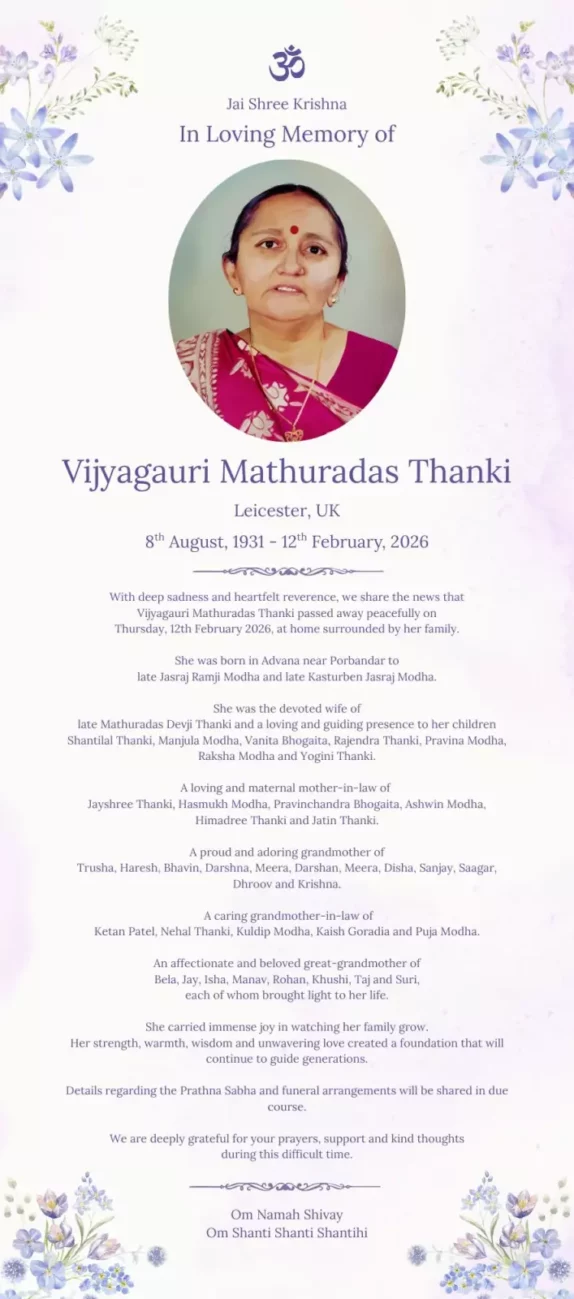 The family requests that well wishers kindly consider a charitable donation to Sri Bardai Brahmin Samaj Leicester, UK, instead of floral tributes.