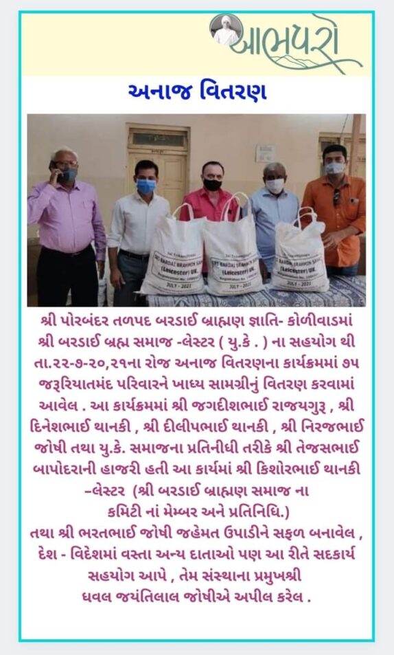 The distribution was completed under the supervision of Tejas K Bapodra and the Talpad Brahmin Samaj Porbandar. A total of 75 families including 8 Covid -19 affected families, received the food parcel packed in a recyclable fabric bag with the Samaj’s logo and charity reference no. (Photographed for our records). The bags were donated by Tejas K Bapodra as a goodwill gesture. The total value of this distribution was £1169.25 which included a £50 donation to the Talpad Brahmin Samaj Porbandar.