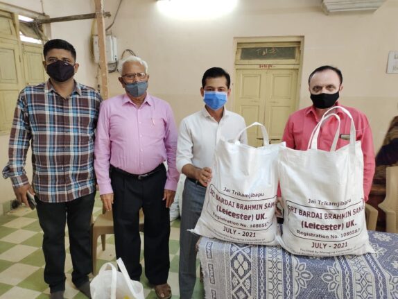 Dr Kishorechandra Thankey, Committee Member followed this up and connected with Tejas K Bapodra (local volunteer and samaj sewak), and the staff at Bardai Brahmin Samaj Korivad Vandi, Porbandar. After an in-depth review, the Management Committee of Leicester opted for the provision of dry food parcels to vulnerable families registered on the Bardai Talpad Brahmin Samaj Korivad Vandi’s database. The Committee appointed Tejas K Bapodra, a known local charity worker to organise the purchase, packing, and distribution of the food parcels on behalf of our Samaj.