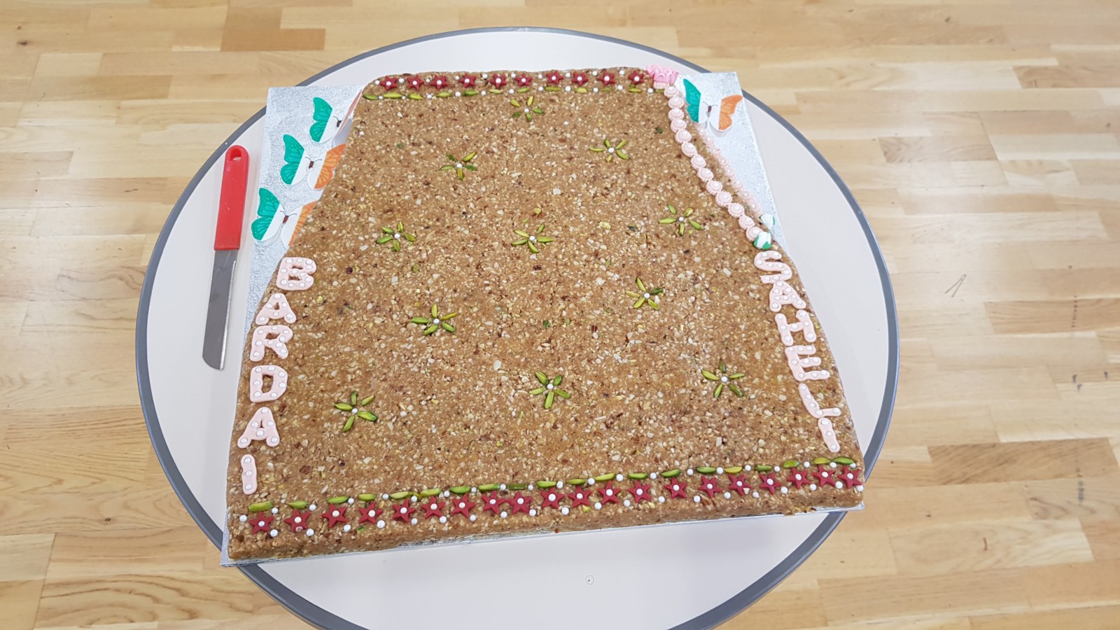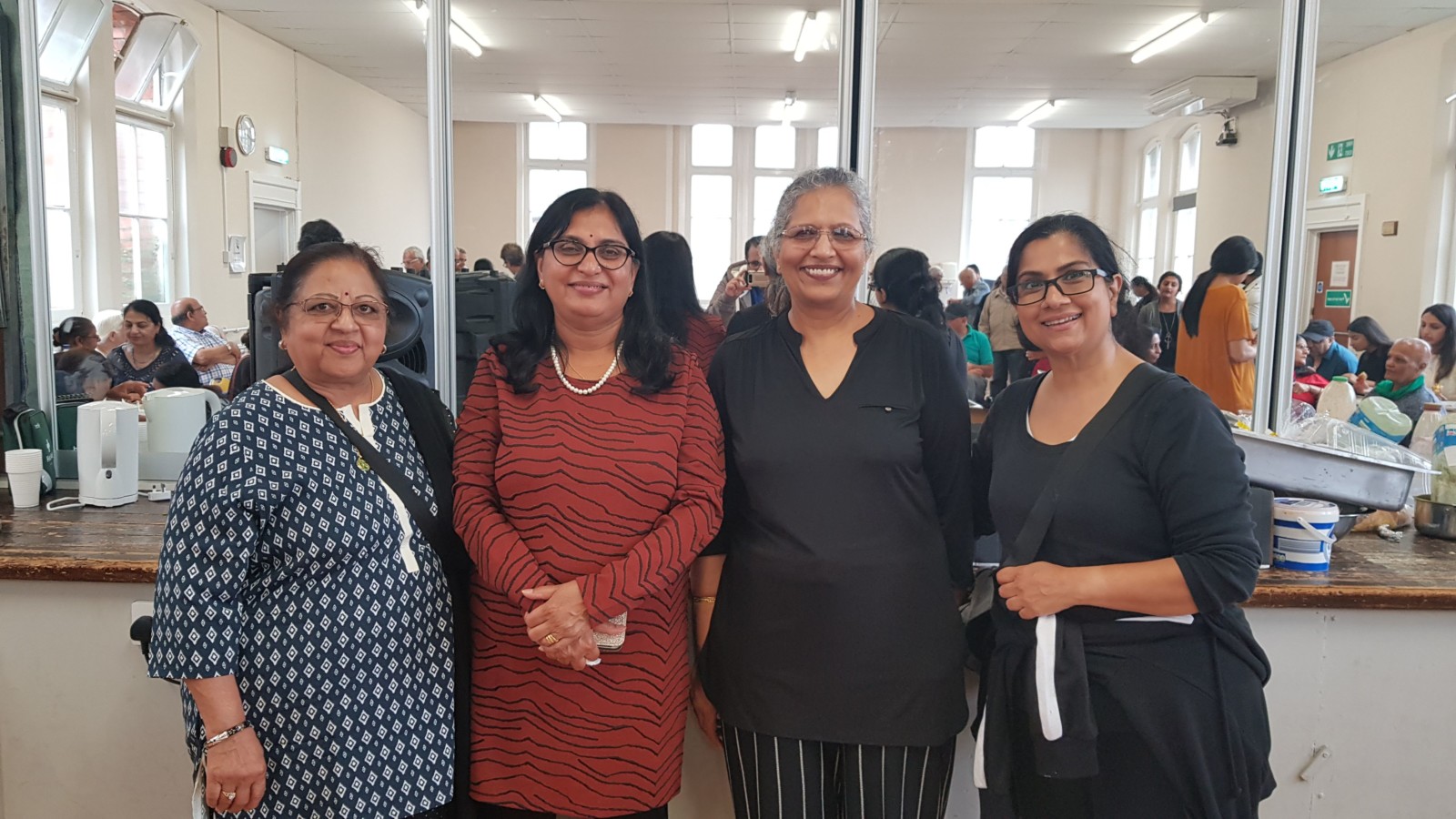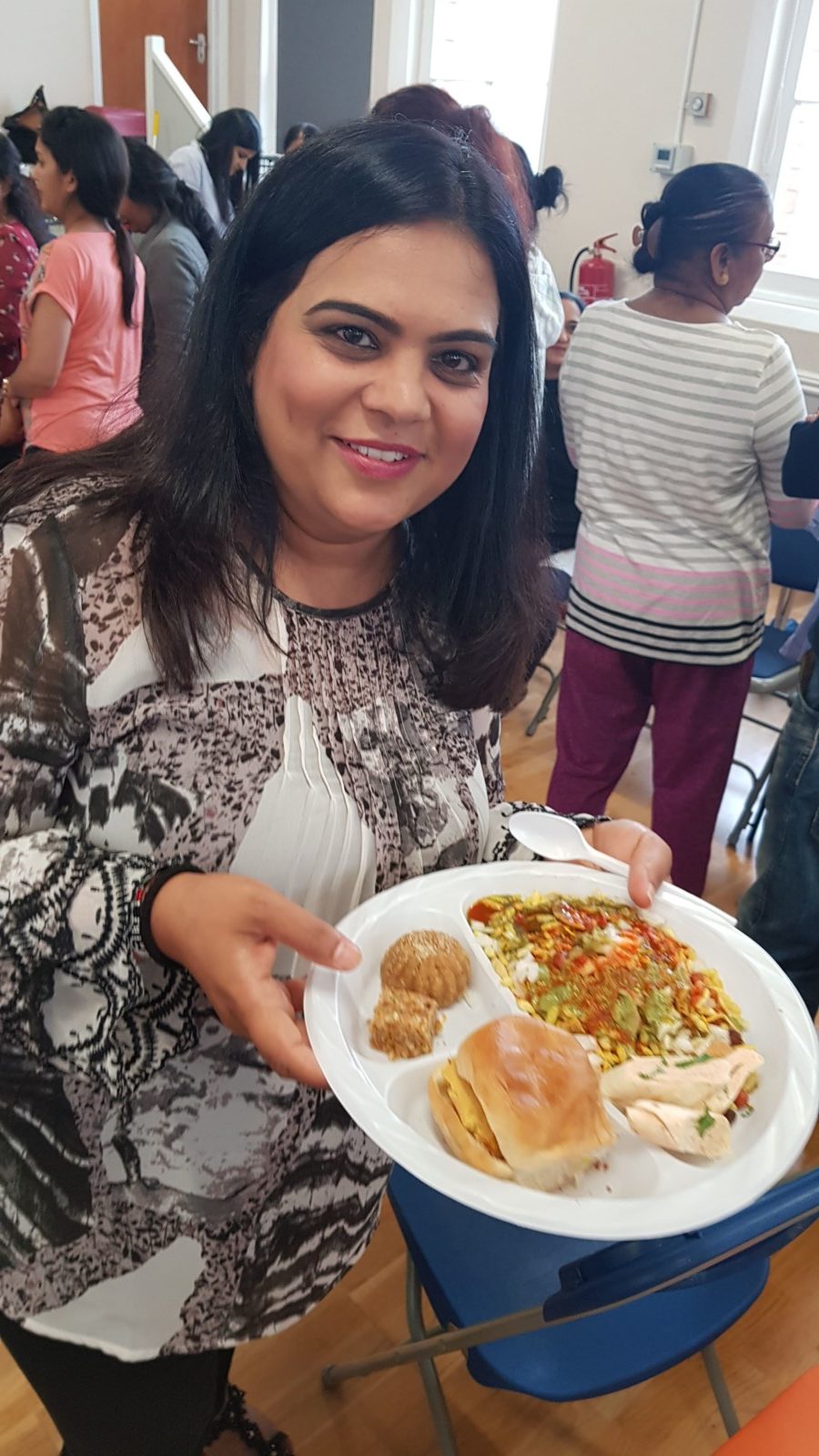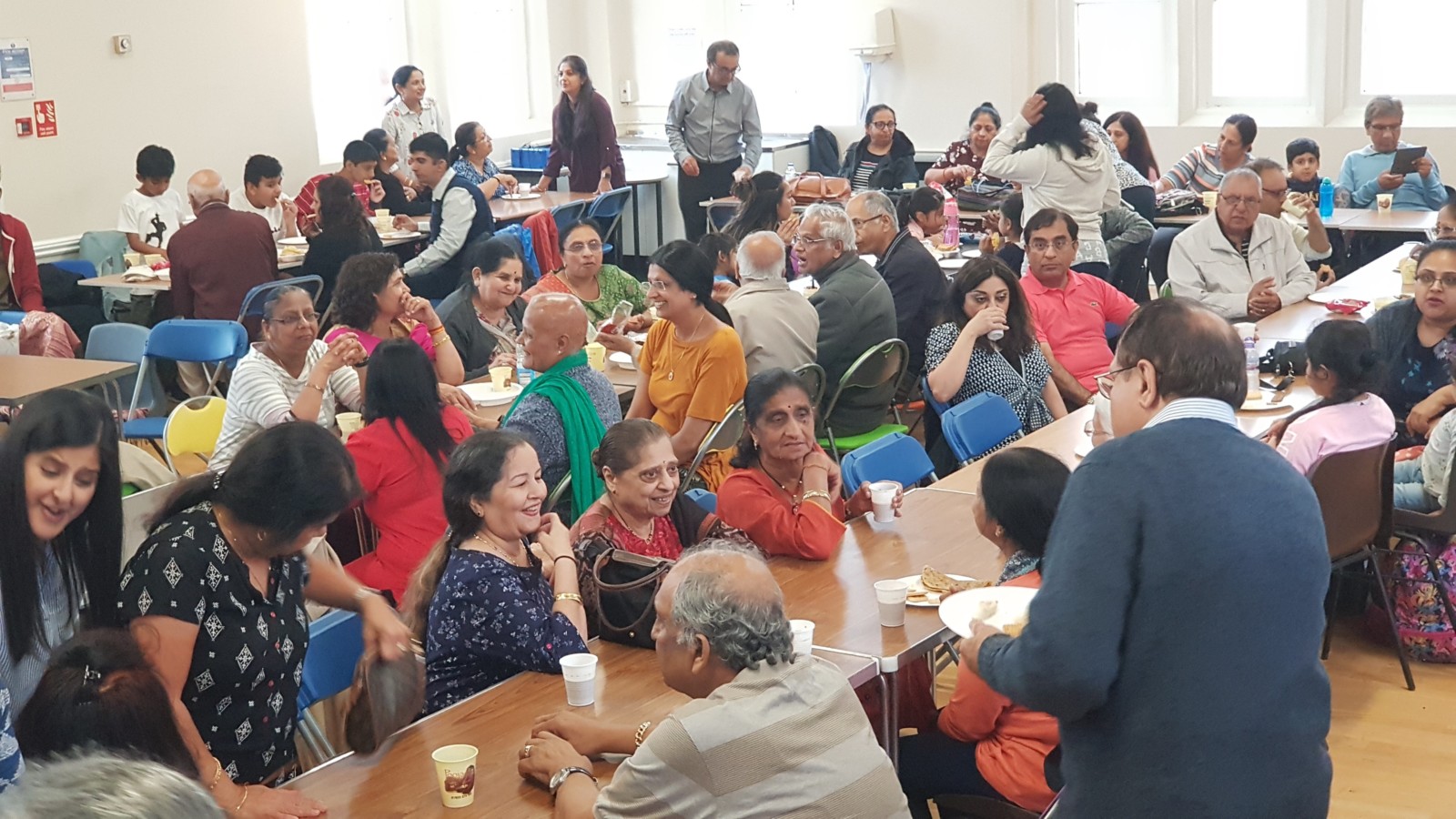 1.15pm – Cake cut to celebrate 2nd year of Saheli Group activity. The cake was hand made by Rekhaben Bapodra of a biscuity base in the shape of a skirt and tasted delicious. Hansaben Rajyaguru jointly cut the cake on behalf of SBBS Leicester UK. A voluntary contribution was made by all attendees to share the unexpected venue and food cost for which everyone was thankful. This was followed by lunch with Bhel, Vada Pau, Batetawada, Chevro, chutneys, soft drinks (squash) and water. For Faraar, there was batetanu farari shaak, farari chevro, chutney – delish! All other food everyone had brought in to share was passed around the tables.